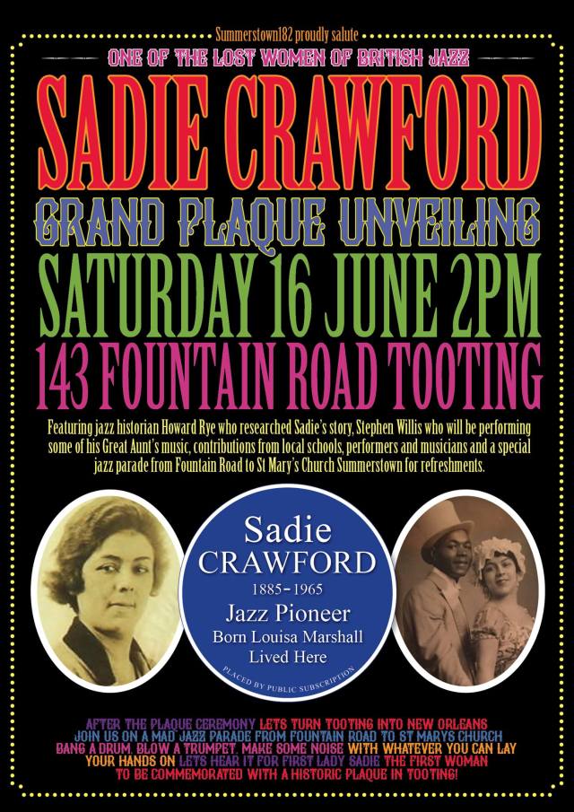 Sadie Crawford, Tooting-born jazz musician will be celebrated on Saturday with a plaque unveiling on Fountain Road. The youngest of seven children, Sadie was born Louisa Harriet Marshall on 27 December 1885. She became a jazz saxophonist and dancer and toured throughout Europe. In 1930, she moved to the US. The unveiling, organised by Summerstown182, will be at 2pm, followed by a jazz parade to St. Mary’s Church, Summerstown. More details of Sadie Crawford here.