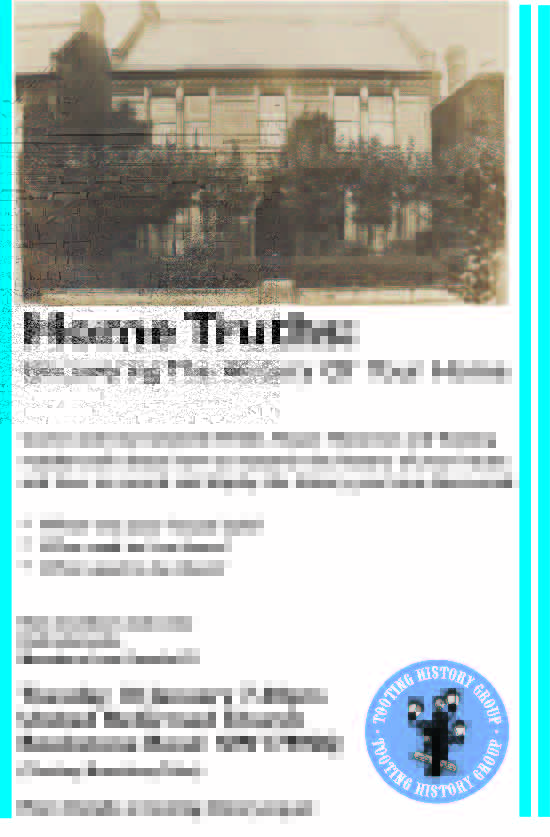 Our next Tooting History Group meeting is a talk entitled “Home Truths: Uncovering The Secrets of Your Home” by Danielle Wilde, house historian and Tooting resident. The meeting is next Tuesday 10th January, 7.30pm at The United Reformed Church, Rookstone Road, Tooting , SW17 9NQ.