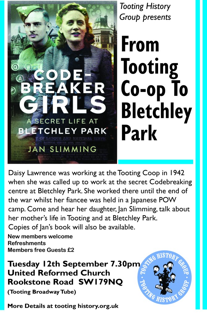 Daisy Lawrence was born in Tooting in 1917. She left Sellincourt School aged 14 and went to work at the Tooting Co-Op. In 1942, she was called up to work at the Bletchley Park code breaking centre. Whilst she was working on breaking Japanese codes, her fiancée was held as a POW in the Far East. Daisy’s daughter, Jan Slimming, has written an account of her mother’s life and will be speaking to our September monthly meeting. You will also be able to buy copies of Jan’s book.