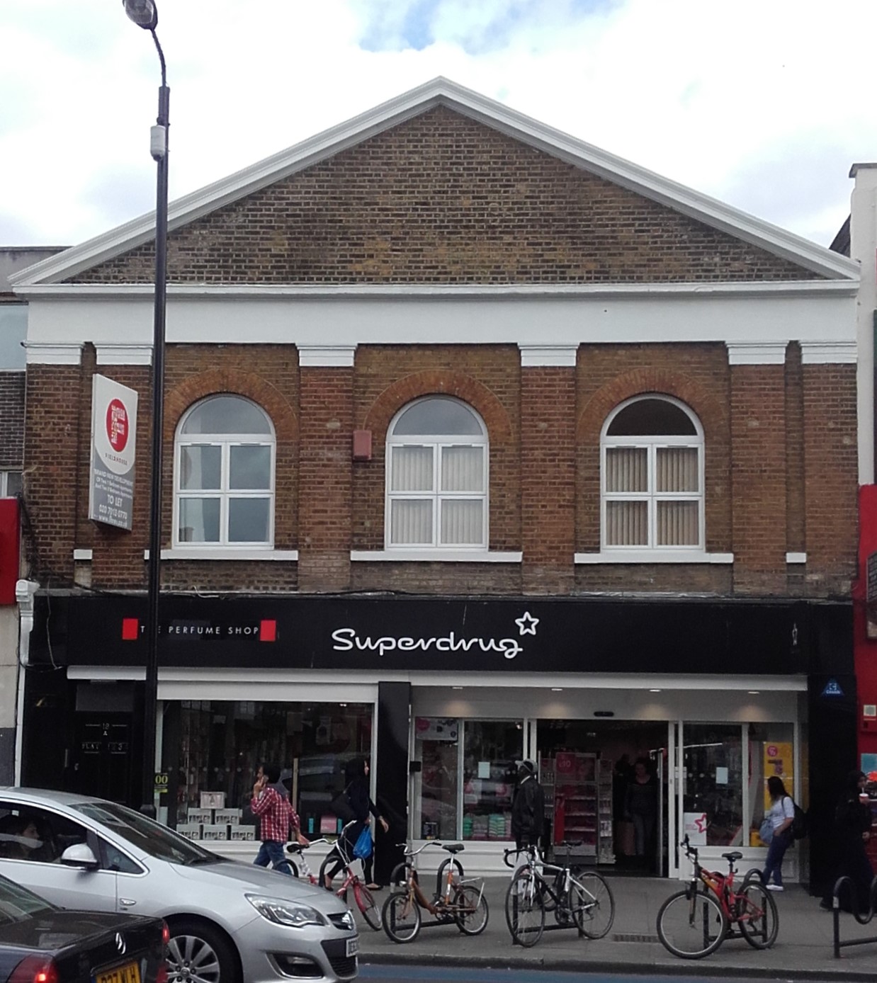 Built in 1776 for a congregation established in 1688, two storey pedimented classical front’ (Pevsner) on the grounds of a previous wooden church where Dissenters met in secret to escape persecution. Local folklore suggests Daniel Defoe was amongst them and the chapel named after him continued as a place of worship for Non-Conformists until 1902 when it was sold to the Primitive Methodists. In 1911 it was sold for commercial use. Before that time, c1910 Alderman William Melluhish, undertaker and stonemason oversaw the removal of burials within the chapel building and re-interment of remains to a Streatham cemetery. In 2014 Tooting History Group members united with the congregation of the United Reform Church,Tooting to resist alteration to the front elevation and development at the rear of the building. Plans to remodel the façade were withdrawn and in 2015, during works to extend the retail premises, human remains were unearthed in the cemetery grounds and re-interred on the site at two ceremonies conducted by Reverend Helen Matthews of the URC.