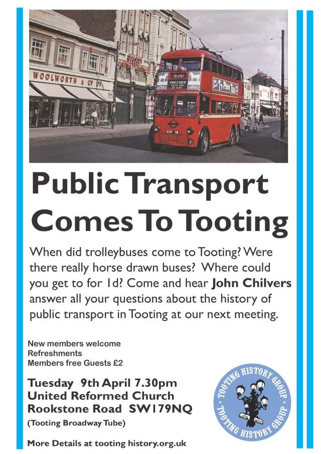 When did trolleybuses come to Tooting? Where could you get to for 1d? Were there really horse drawn buses through Tooting. Our next meeting on Tuesday 9th April at 7.30pm will be a talk by John Chilvers on the coming of public transport to Tooting.