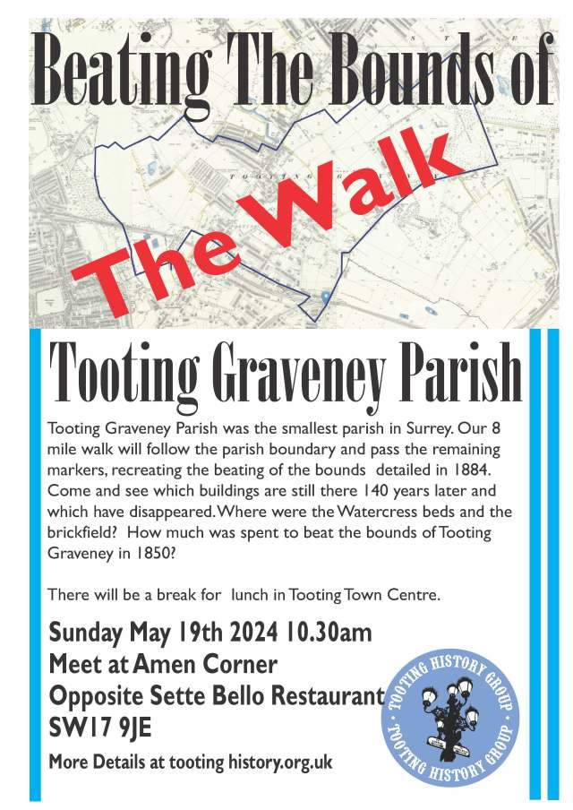 And on Sunday May 19th, we will be walking the 8 mile boundary of Tooting Graveney Parish. Starting at 10.30am at Amen Corner, SW17 (Opposite Sette Bello restaurant), we will be progressing round the Parish, stopping to see which buildings and features survive from 1884 and which have disappeared. There will be a break for lunch in Tooting Town Centre and we should finish back at Amen Corner about 3.30pm.
