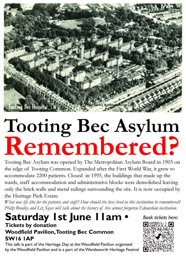 Come and hear Philip Bradley and Liz Sayce talk about the history of Tooting Bec Hospital at The Woodfield Pavilion, Tooting Bec Common, SW16 1AP on Saturday 1st June at 11am.