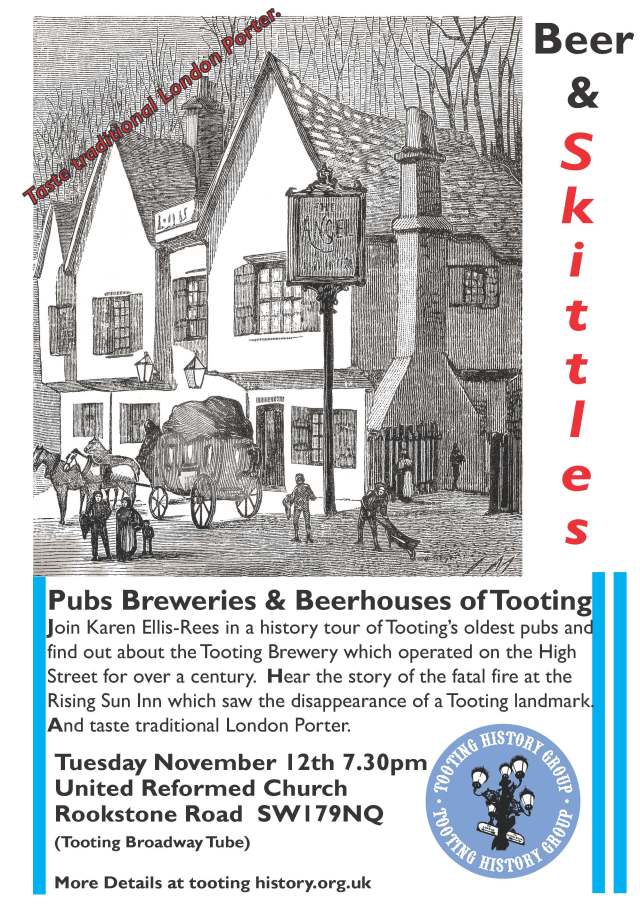 Our next meeting will be a bit different! Join Karen Ellis-Rees in a history tour of Tooting’s oldest pubs, and find out about the Tooting Brewery, which operated on the High Street for at least a century. Also hear the story of the fatal fire at the Rising Sun Inn, which saw the disappearance of a Tooting landmark. And there will be a chance to taste locally brewed London Porter as made across London in the 19th Century.