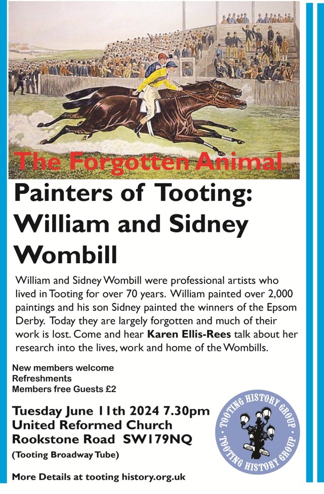 William and Sidney Wombill were professional artists who lived in Tooting for over 70 years. William painted over 2,000 paintings and his son Sidney painted the winners of the Epsom Derby, but today they are largely forgotten and much of their work is lost. Come and hear Karen Ellis-Rees talk about her research into the lives, work and home of the Wombills.