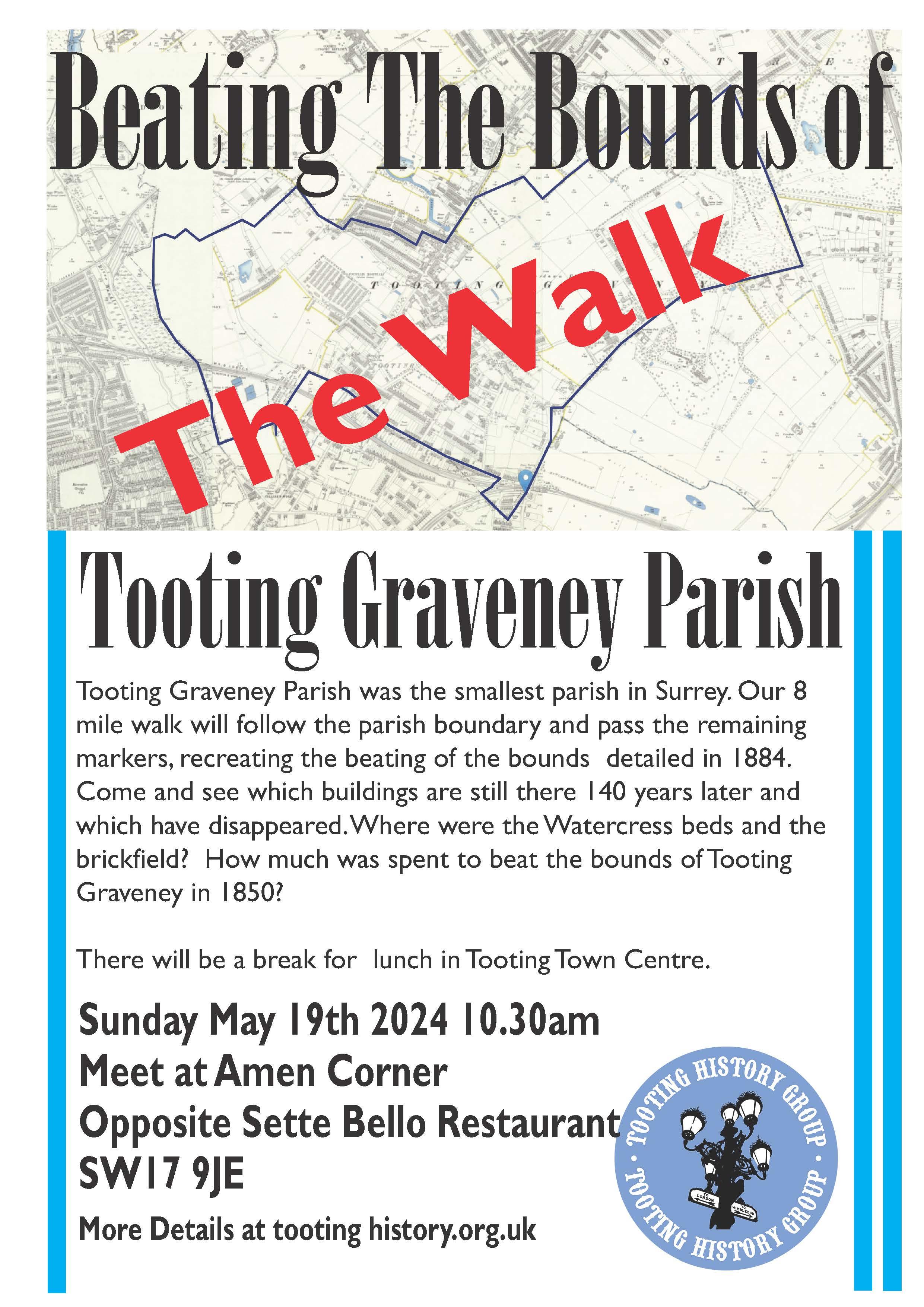 And on Sunday May 19th, we will be walking the 8 mile boundary of Tooting Graveney Parish. Starting at 10.30am at Amen Corner, SW17 (Opposite Sette Bello restaurant), we will be progressing round the Parish, stopping to see which buildings and features survive from 1884 and which have disappeared. There will be a break for lunch in Tooting Town Centre and we should finish back at Amen Corner about 3.30pm.