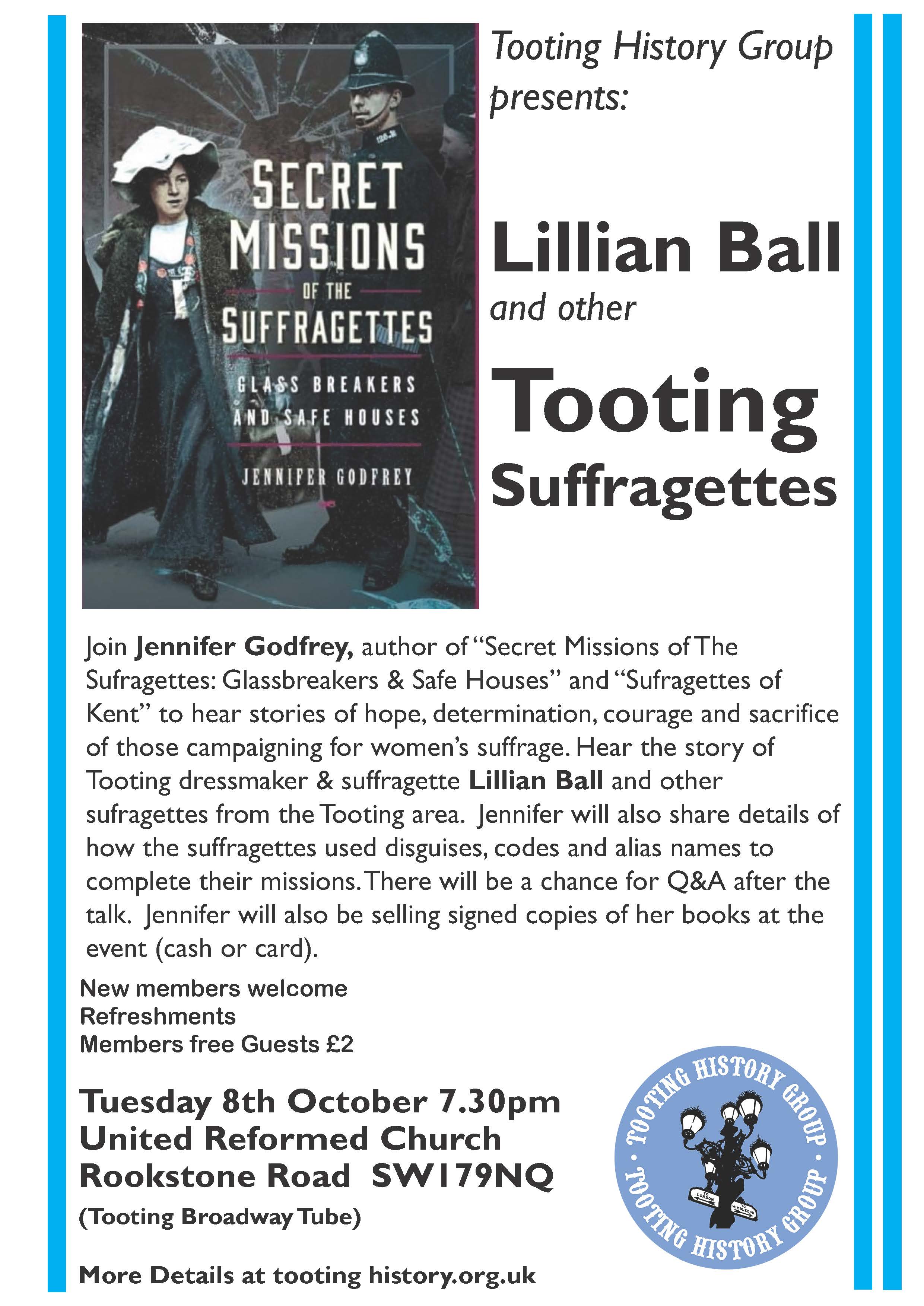 Join Jennifer Godfrey, author of SECRET MISSIONS OF THE SUFFRAGETTES: GLASSBREAKERS & SAFE HOUSES and SUFFRAGETTES OF KENT, to hear stories of hope, determination, courage and sacrifice of those campaigning for women’s suffrage. Topics covered will include the story of Tooting dressmaker & Suffragette Lillian Ball and those of other women from the Tooting area. Jennifer will also share details of how the suffragettes used disguises, codes and alias names to complete their missions. There will be a chance for Q&A after the talk. Jennifer will also be selling signed copies of her books at the event (cash or card).