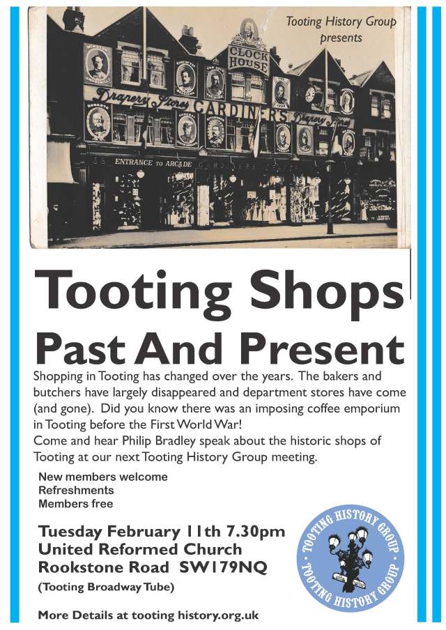 Come and hear Philip Bradley talk about some of the shops of Tooting past at our next monthly meeting on Tuesday 11th February 2025 at 7.30pm. We meet at the United Reformed Church, Rookstone Road, SW179NQ.