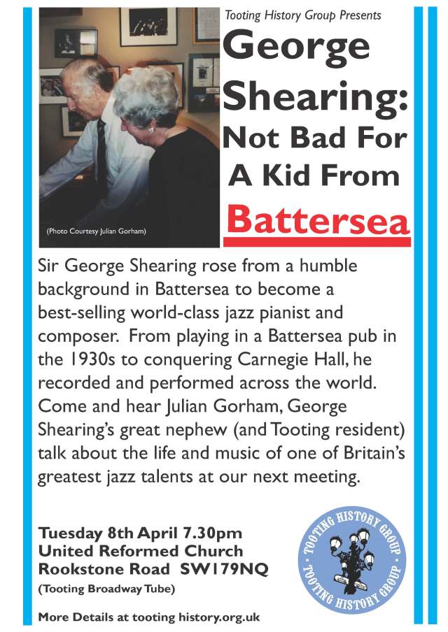 Sir George Shearing rose from a humble background in Battersea to become a best-selling world-class jazz pianist and composer. From playing in a Battersea pub in the 1930s to conquering Carnegie Hall, he recorded and performed across the world. Come and hear Julian Gorham, Sir George Shearing’s great nephew (and Tooting resident) talk about the life and music of one of Britain’s greatest jazz talents at our next meeting.