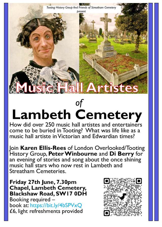 Join Karen Ellis-Rees of London Overlooked/Tooting History Group, Peter Winbourne and Di Berry for an evening of stories and song about the once shining music hall stars who now rest in Lambeth and Streatham Cemeteries. This presentation of words and music will take place in the Chapel of Lambeth Cemetery on Blackshaw Road. Friday 27th June 2025 7.30pm. Chapel, Lambeth Cemetery, Blackshaw Road, SW17 0DH (Entrance between Fountain And Bertal Roads)