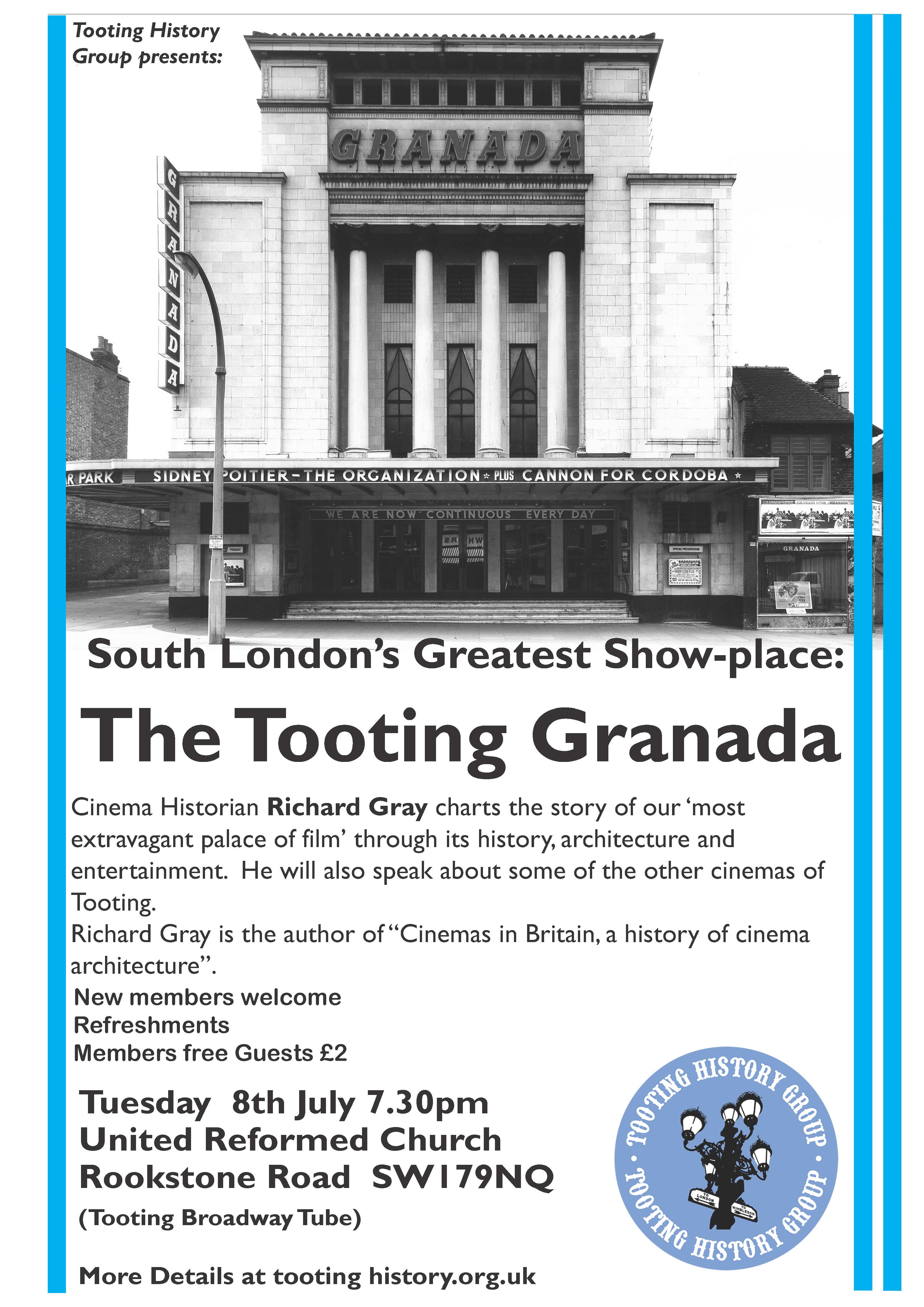 The Tooting Granada (“Buzz Bingo”) is the only Grade 1 listed building in Tooting and the only Grade 1 listed Cinema in the UK. Richard Gray is a historian of Cinema architecture and will be telling us about “South London’s Greatest Showplace” through it’s history, architecture and entertainment. We will be showing clips of early films shown at The Granada. He will also speak about some of the other seven cinemas of Tooting and their demise.