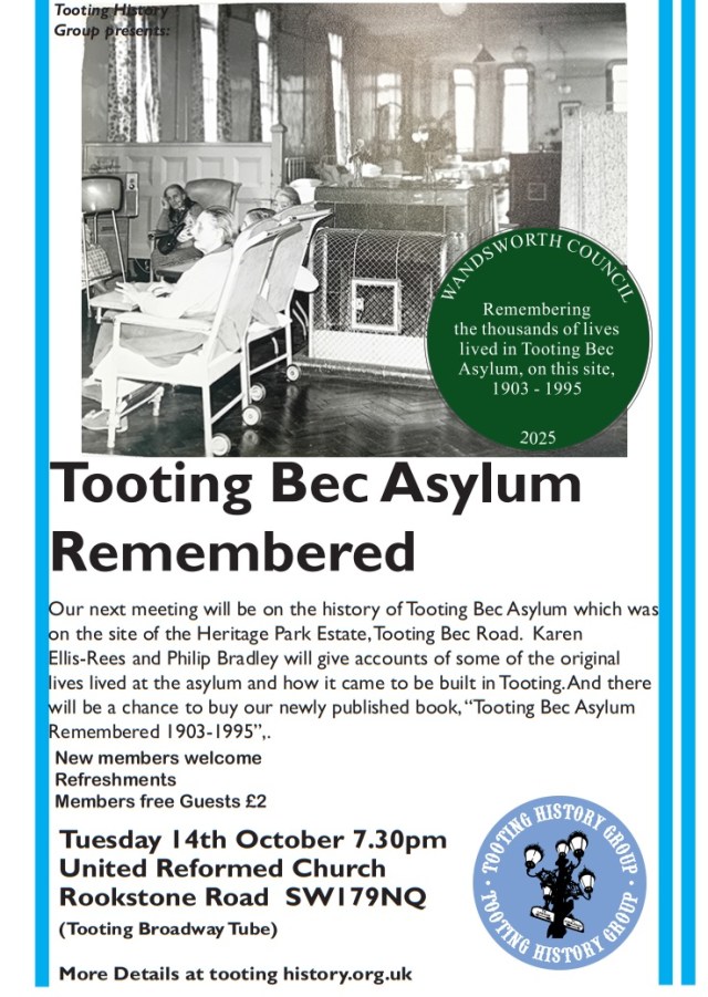 Karen Ellis-Rees and Philip Bradley will give accounts of some of the original lives lived at the asylum and how it came to be built in Tooting. And there will be a chance to buy our newly published book “Tooting Bec Asylum Remembered 1905-1995”.