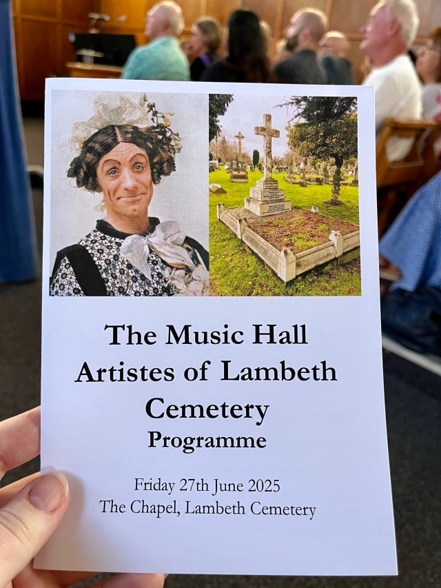 As part of the 2025 Wandsworth Heritage Festival, Tooting History Group organised an evening of stories about and songs by the music hall artistes buried in Lambeth Cemetery. The event was held in one of the two cemetery chapels on a particularly warm evening in June. All 100 tickets sold out, and the proceeds went to Tooting History Group and Friends of Streatham Cemetery and to a charity chosen by the performers.